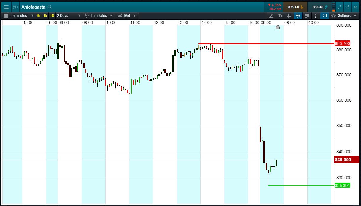 - Antofagasta shares have fallen 5.3% from yesterday’s 883p highs to trade 836p (at time of writing)