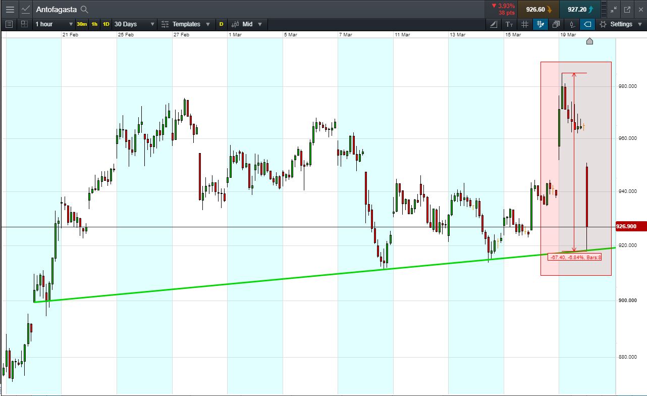 Conversely, let’s assume you open the above position, and place a stop-loss at 3% from the current price. Antofagasta falls 3% and hits your stop-loss. Your loss would be £300.