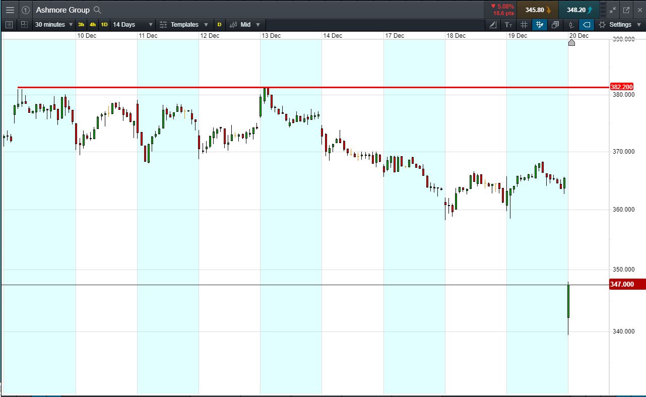 Let’s say you feel that the stock is a bargain and you think could bounce back towards 382p. You decide to buy exposure to £10,000 worth of Ashmore using a CFD, at the current price of 341.2p. To do this, you need £2,000.