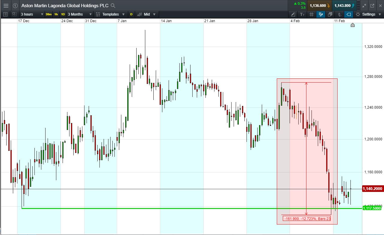 Let’s assume Aston Martin recovers back to 1272p February highs (+11.5%). Your profit would be £1150, from your initial investment of £2,000.