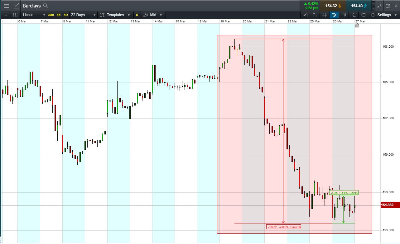 Let’s say you feel that the stock is a bargain and you think could bounce back towards 169p. You decide to buy exposure to £10,000 worth of Barclays using a CFD, at the current price of 154p. To do this, you need £2,000.