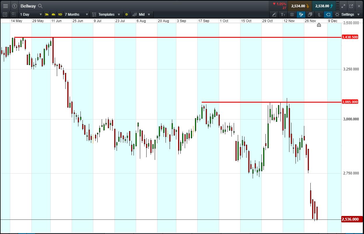 Let’s say you feel that the stock is a bargain and you think could bounce back towards 3108p. You decide to buy exposure to £10,000 worth of Bellway using a CFD, at the current price of 2536p. To do this, you need £2,000.