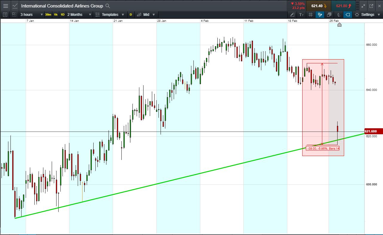 Let’s say you feel that the stock is a bargain and you think could bounce back towards 654p. You decide to buy exposure to £10,000 worth of British Airways owner IAG using a CFD, at the current price of 621p. To do this, you need £2,000.