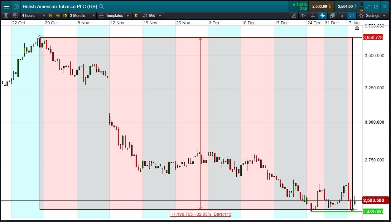 Let’s assume British American Tobacco recovers back to 3650p October highs (+45.8%). Your profit would be £4580, from your initial investment of £2000.