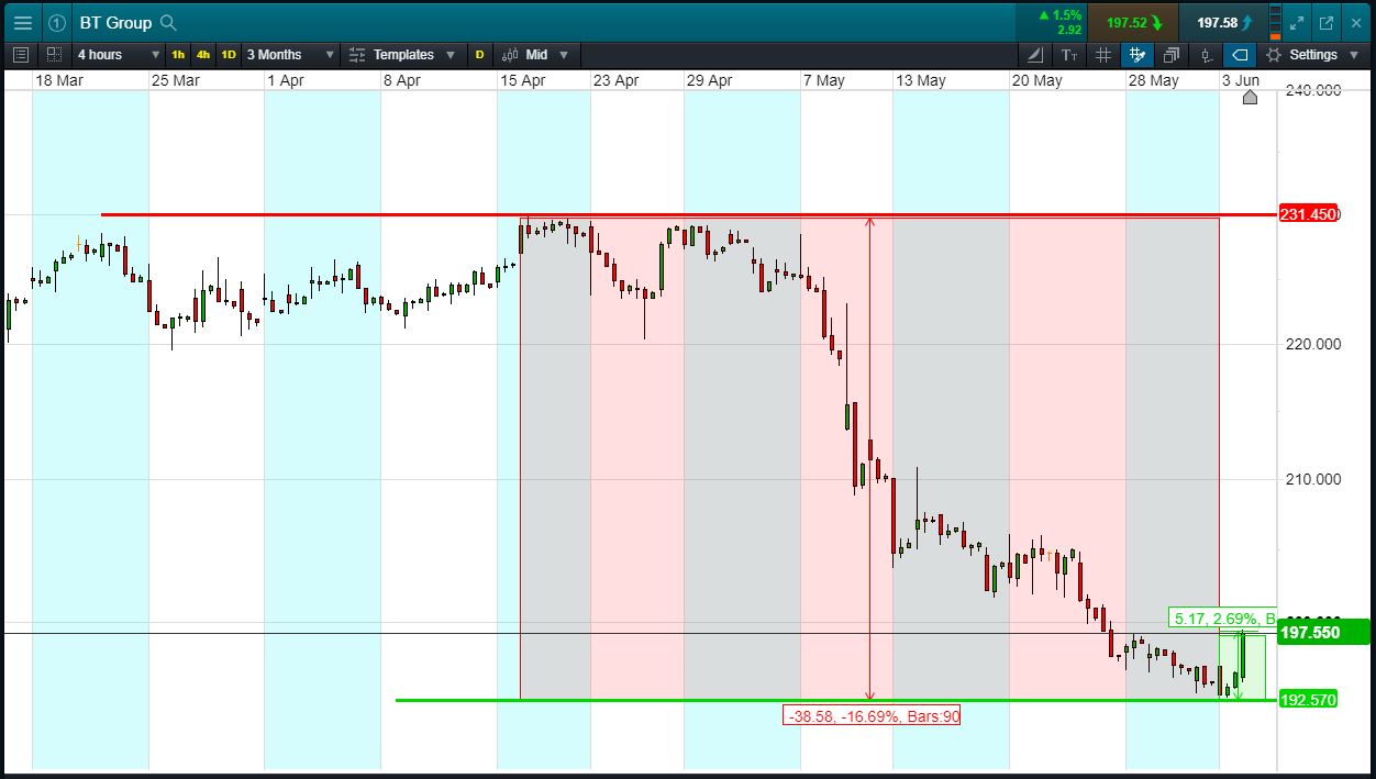 Let’s say you feel that the stock is a bargain and you think could bounce back towards highs of 231p. You decide to buy exposure to £10,000 worth of BT using a CFD, at the current price of 197p. To do this, you need £2,000.