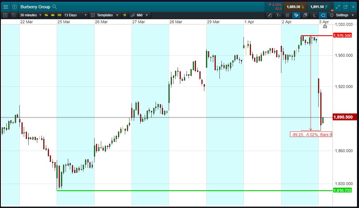 Let’s assume Burberry recovers back to 1976p highs (+4.5%). Your profit would be £450, from your initial investment of £2,000.