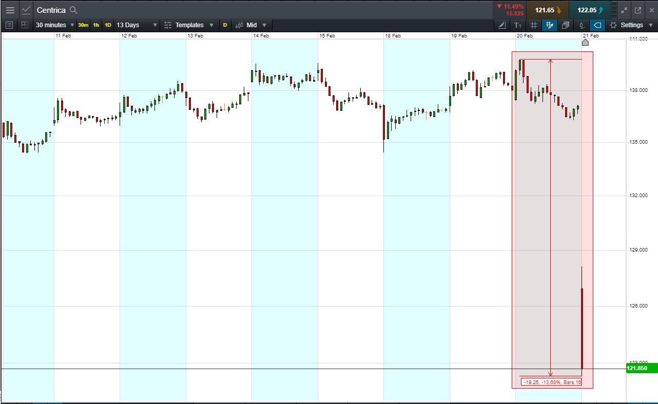 Let’s say you feel that the stock is a bargain and you think it could bounce back to recent high of 140p. You decide to buy exposure to £10,000 worth of Centrica using a CFD, at the current price of 121p. To do this, you need £2,000.