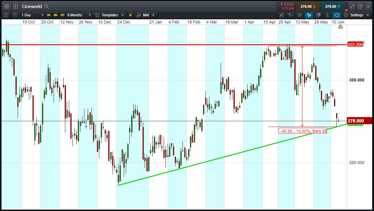 Let’s say you feel that the stock is a bargain and you think could bounce back towards 322p . You decide to buy exposure to £10,000 worth of Cineworld using a CFD, at the current price of 278p. To do this, you need £2,000.