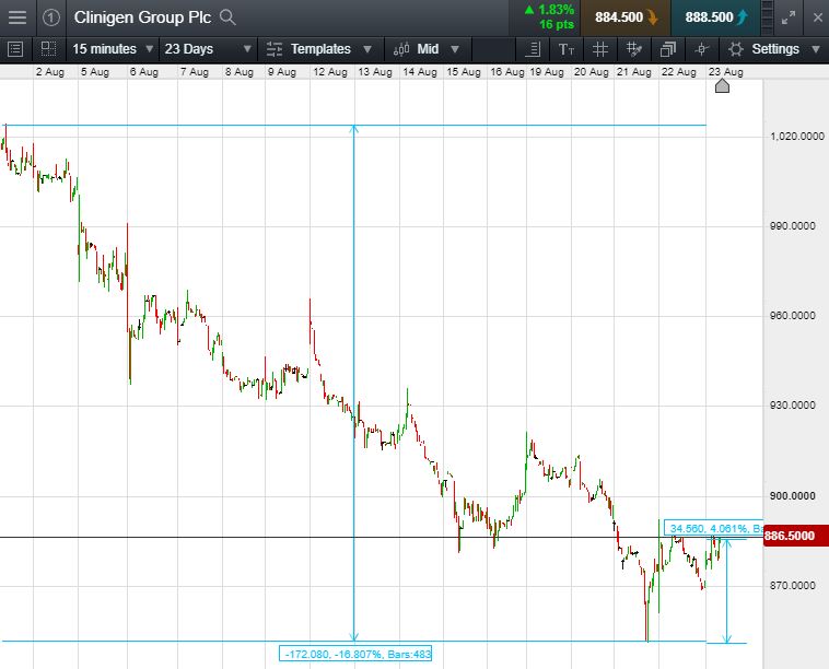 Will Clinigen continue falling, or will it recover to 1023p early August highs?