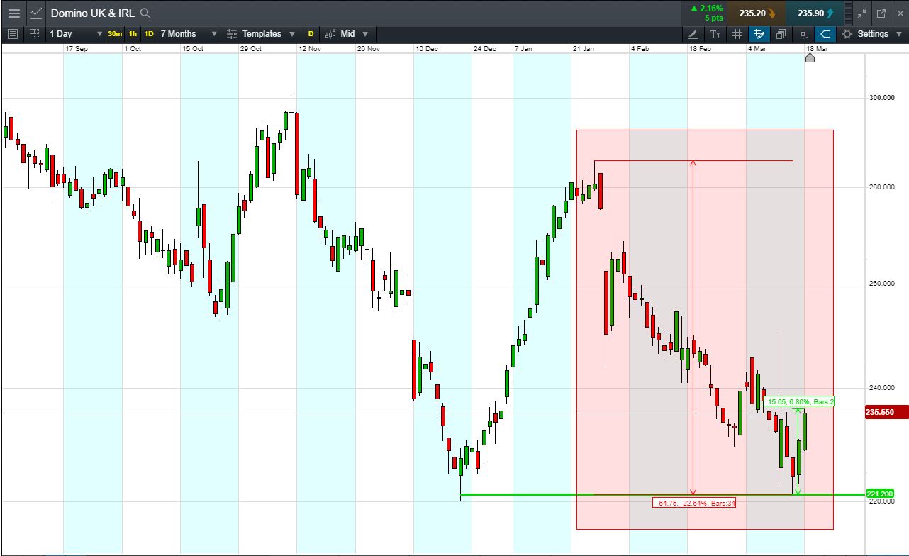 Let’s say you feel that the stock is a bargain and you think could bounce back towards 285p. You decide to buy exposure to £10,000 worth of Domino’s Pizza using a CFD, at the current price of 235p. To do this, you need £2,000.