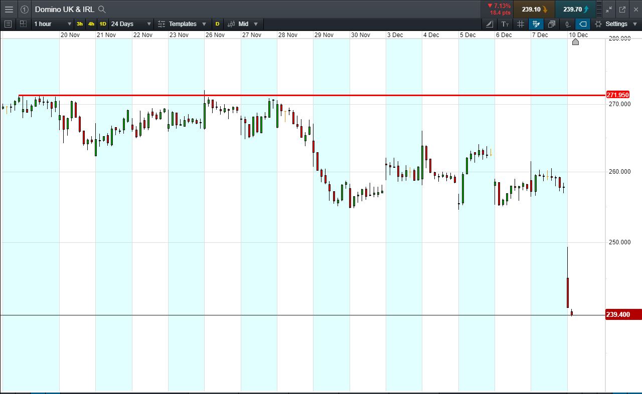 Let’s say you feel that the stock is a bargain and you think it could bounce back to recent highs of 272p. You decide to buy exposure to £10,000 worth of Domino’s using a CFD, at the current price of 239p. To do this, you need £2,000.