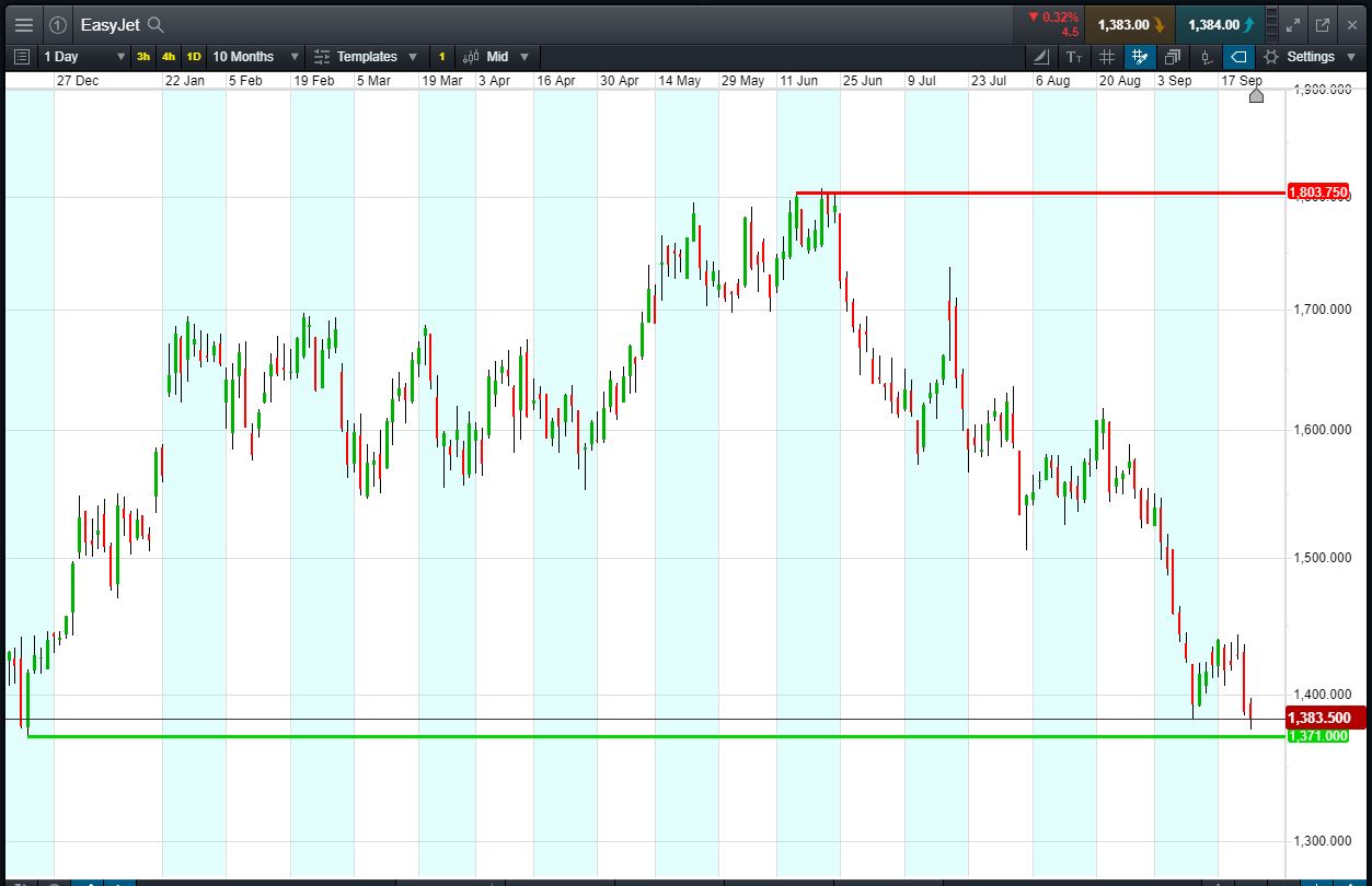 Let’s say you feel that the stock is a bargain and you think could bounce back towards August high of 1,636. You decide to buy exposure to £10,000 worth of easyJet using a CFD, at the current price of 1,383p. To do this, you need £2,000.