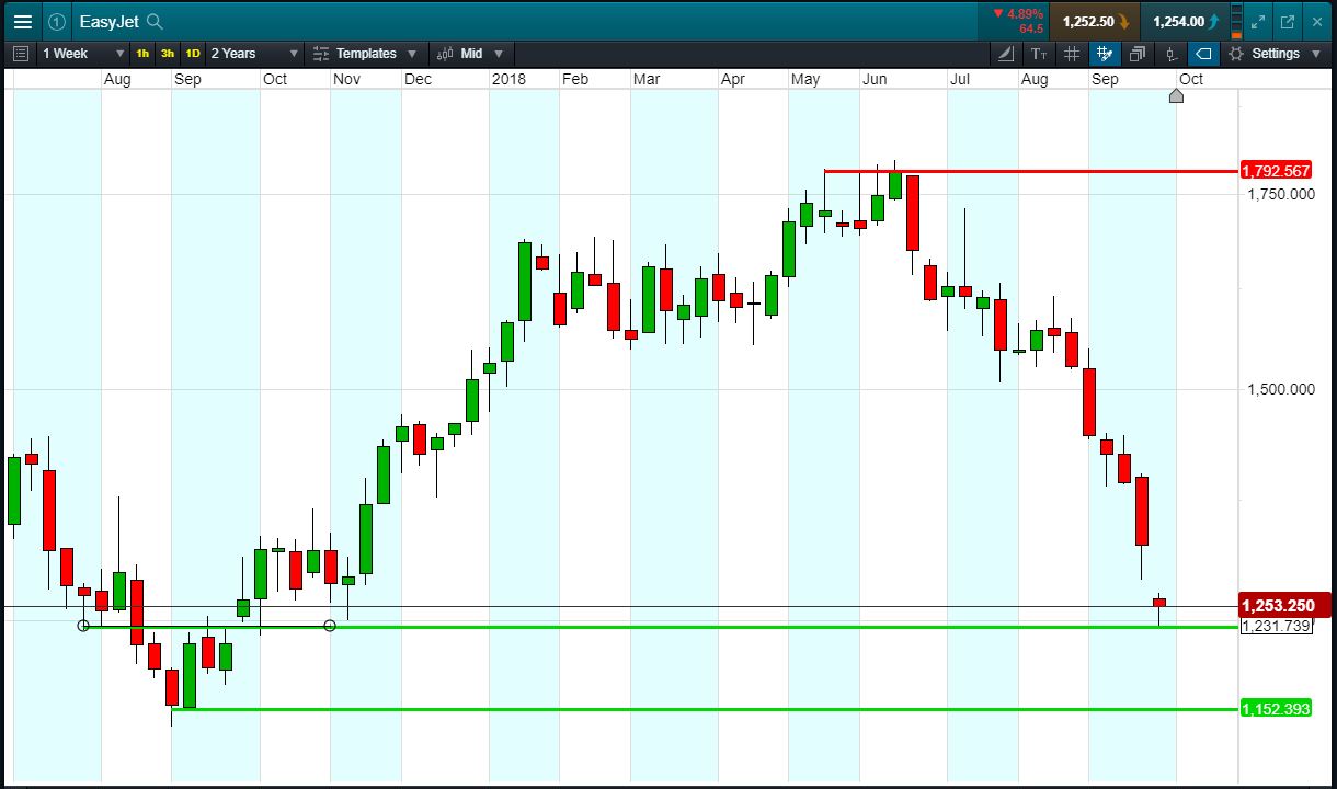 Let’s say you feel that the stock is a bargain and you think could bounce back towards June high of 1,792p. You decide to buy exposure to £10,000 worth of easyJet using a CFD, at the current price of 1,253p. To do this, you need £2,000.