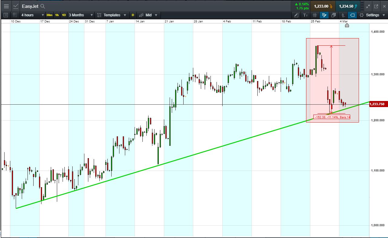 Will easyJet continue falling, or will it recover to last week’s 1367p highs?