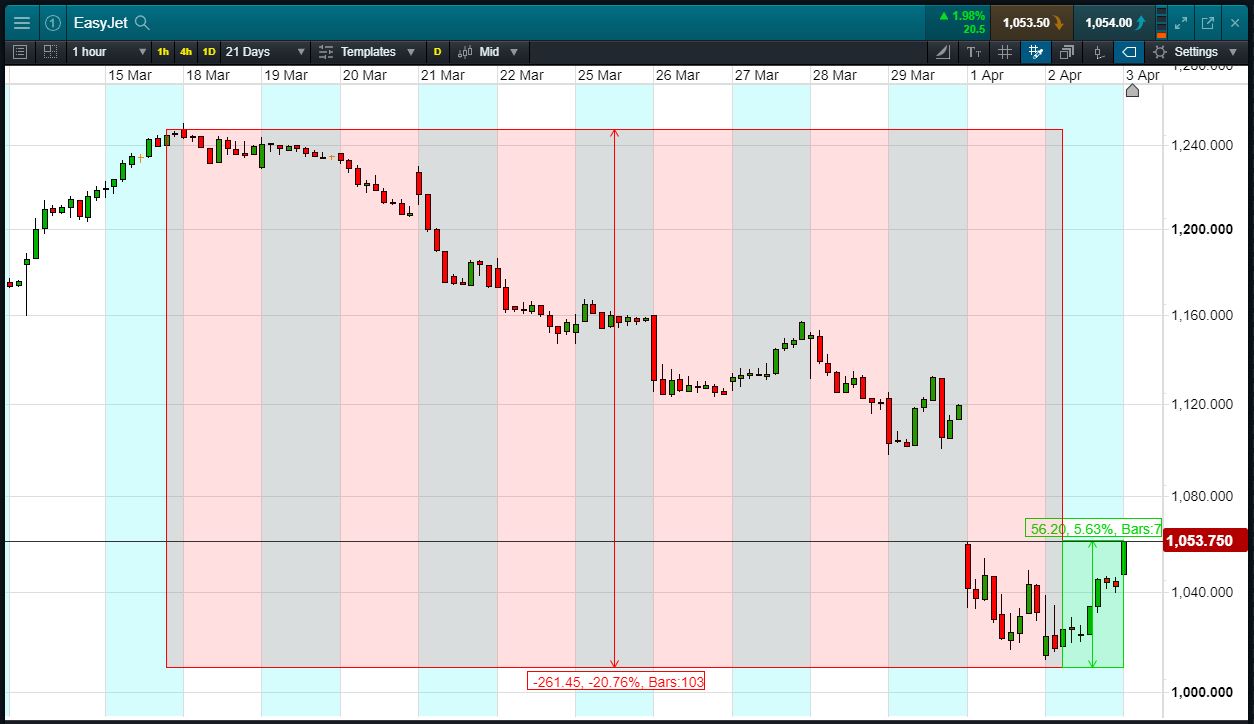Let’s assume easyJet recovers back to 1259p highs (+19.4%). Your profit would be £1940, from your initial investment of £2,000.