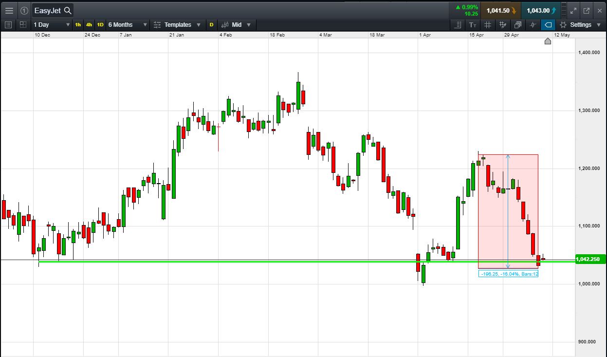 Let’s assume easyJet recovers back to 1223p (+17.3%). Your profit would be £1730, from your initial investment of £2,000.