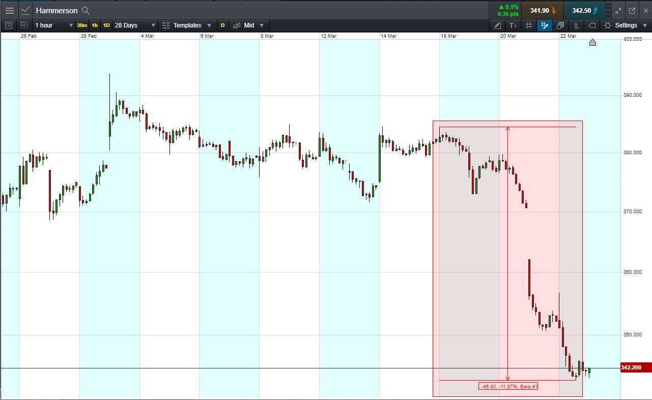 Let’s say you feel that the stock is a bargain and you think could bounce back towards 385p recent highs. You decide to buy exposure to £10,000 worth of Hammerson using a CFD, at the current price of 342p. To do this, you need £2,000.