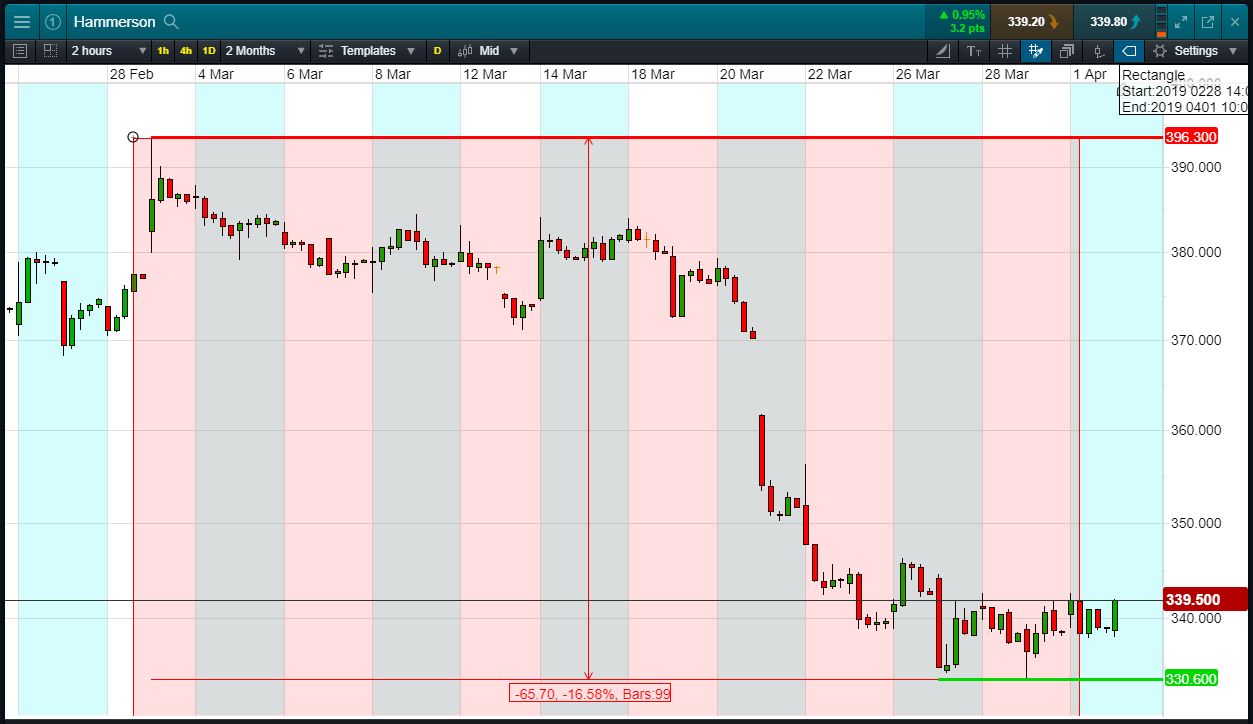 Let’s say you feel that the stock is a bargain and you think could bounce back towards 396p recent highs. You decide to buy exposure to £10,000 worth of Hammerson using a CFD, at the current price of 339p. To do this, you need £2,000.