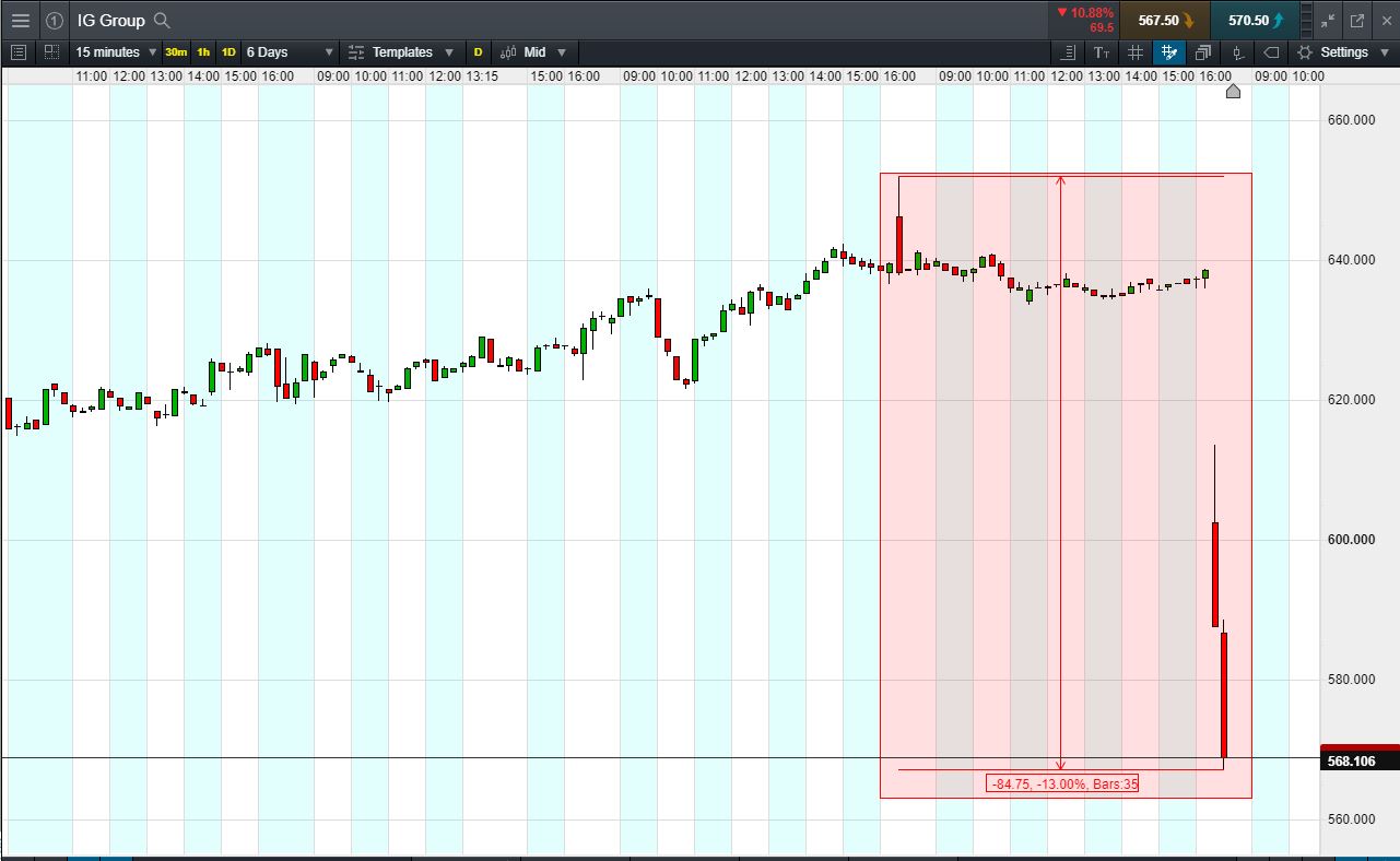 - IG Group fallen over 13% from Monday’s highs.