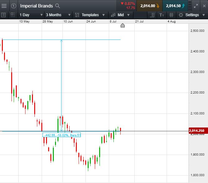 Will Imperial Brands continue falling, or will it rise again back to 2403p May 2019 highs (+18)?