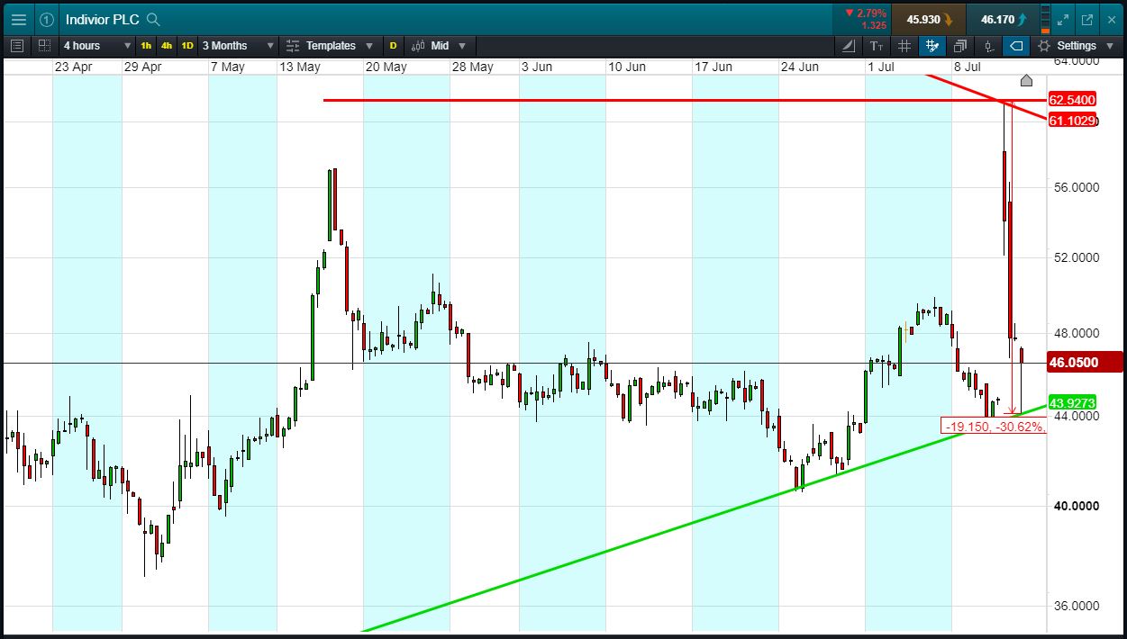 Will Indivior continue falling, or will it recover to recent 62p highs (+34%)?
