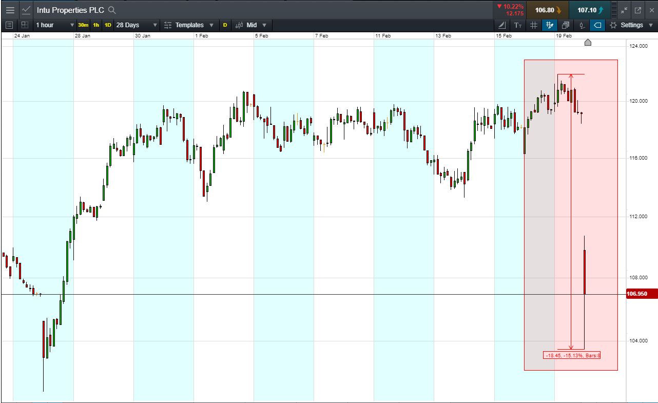 Let’s say you feel that the stock is a bargain and you think it could bounce back to recent high of 121p. You decide to buy exposure to £10,000 worth of INTU Properties using a CFD, at the current price of 106p. To do this, you need £2,000.