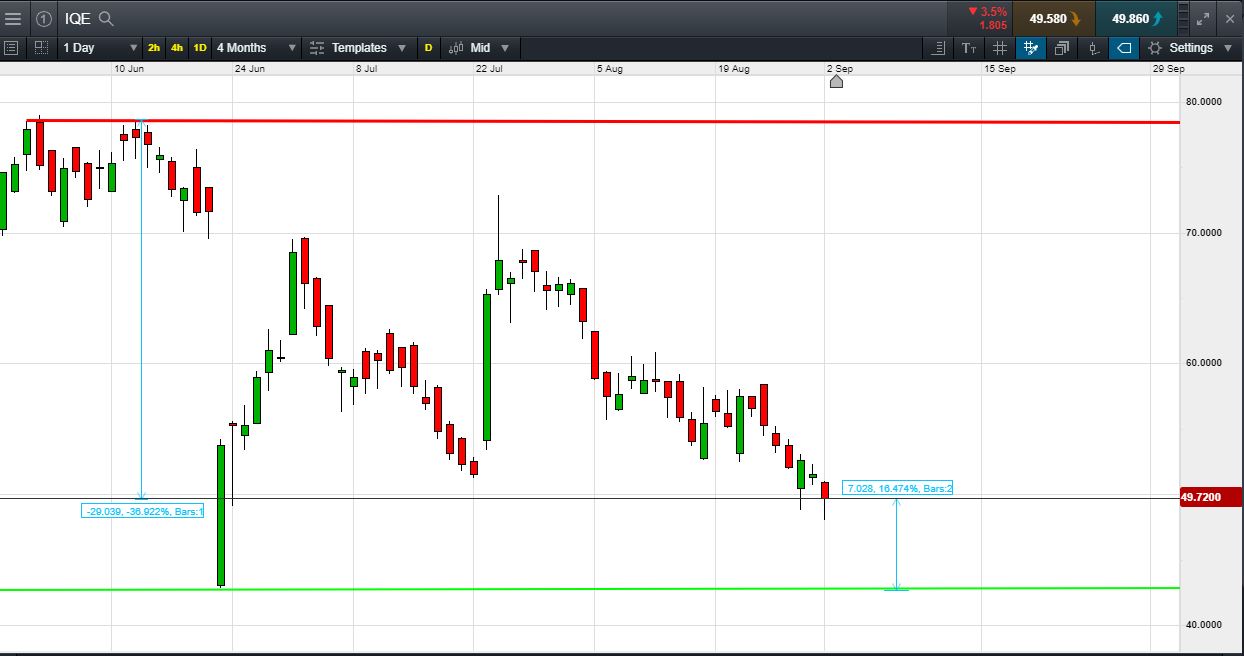 Will IQE continue falling, or will it recover to June highs 78p? (+37%)?