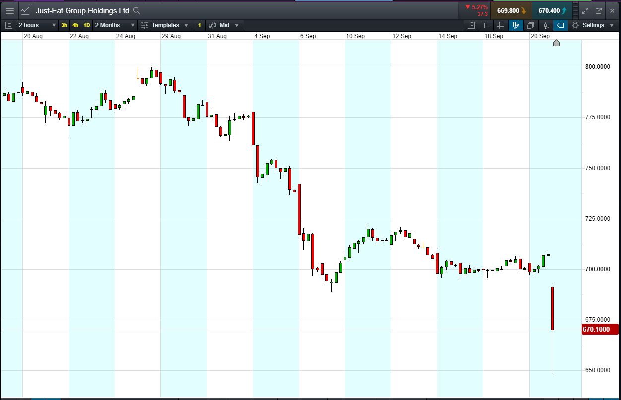 Let’s say you feel that the stock is a bargain and you think could bounce back towards 800p level seen in August. You decide to buy exposure to £10,000 worth of Just Eat using a CFD, at the current price of 670p. To do this, you need £2,000.