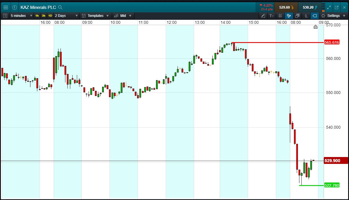 - KAZ Minerals shares have fallen 6.2% from yesterday’s 565p highs to trade 530p (at time of writing)