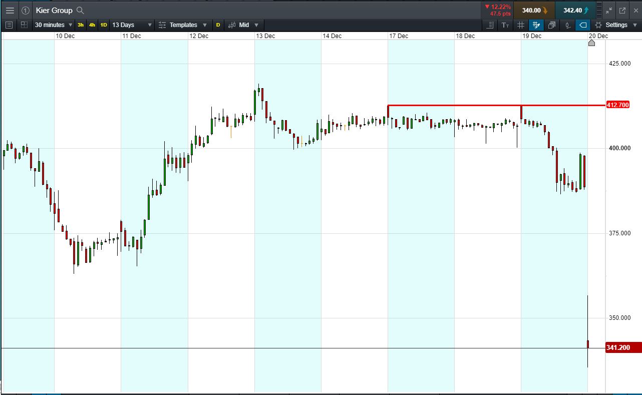 Let’s say you feel that the stock is a bargain and you think could bounce back towards 412p. You decide to buy exposure to £10,000 worth of Kier using a CFD, at the current price of 341.2p. To do this, you need £2,000.