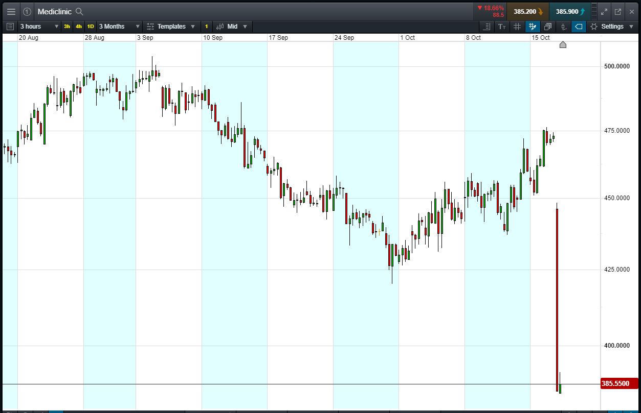 - Mediclinic shares have fallen over 14% in a single week to trade 384p (at time of writing).