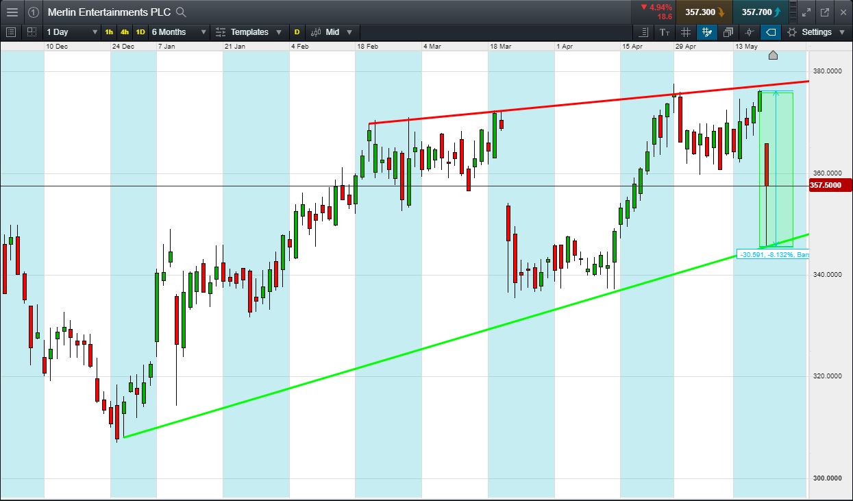 Let’s say you feel that the stock is a bargain and you think could bounce back towards Friday’s 376p highs. You decide to buy exposure to £10,000 worth of Merlin using a CFD, at the current price of 357p. To do this, you need £2,000.