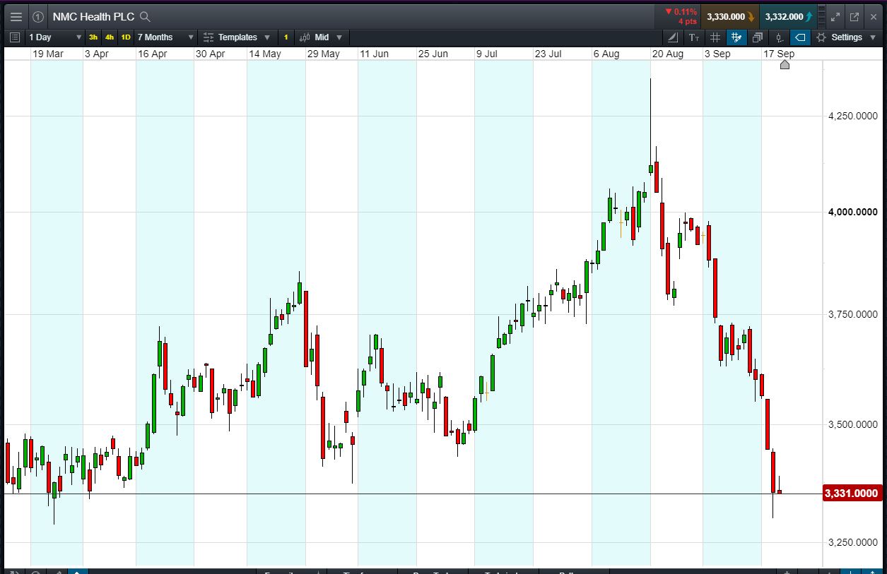 Let’s say you feel that the stock is a bargain and you think could bounce back towards August all-time record highs of 4,375p again. You decide to buy exposure to £10,000 worth of NMC Health using a CFD, at the current price of 3,331p. To do this, you need £2,000.