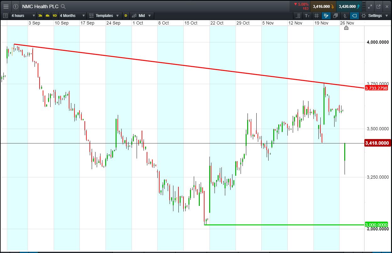 Will NMC Health continue falling, or will it rise again back to 3765p November highs?
