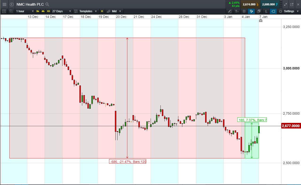 Let’s assume NMC Health recovers back to 3200p mid-December highs (+19.5%). Your profit would be £1950, from your initial investment of £2000.