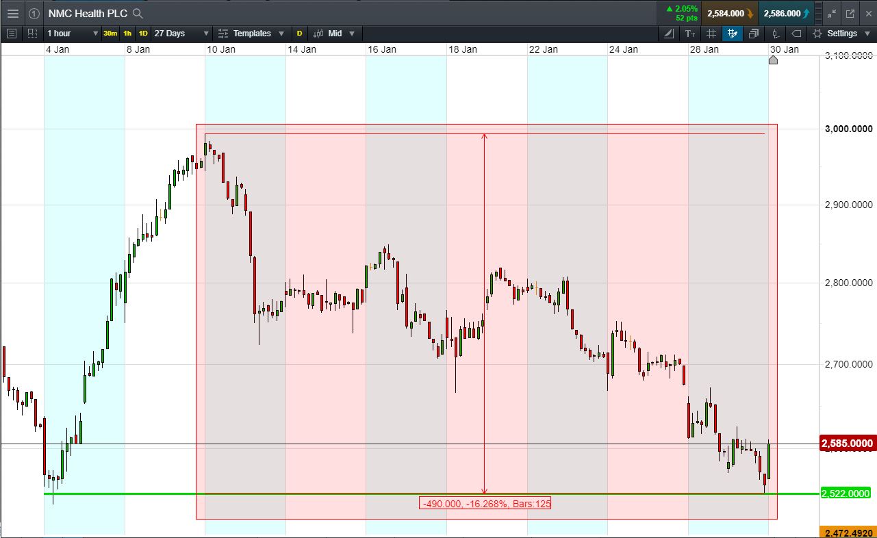 Let’s assume NMC Health recovers back to 3011p recent highs (+16.4%). Your profit would be £1640, from your initial investment of £2,000.