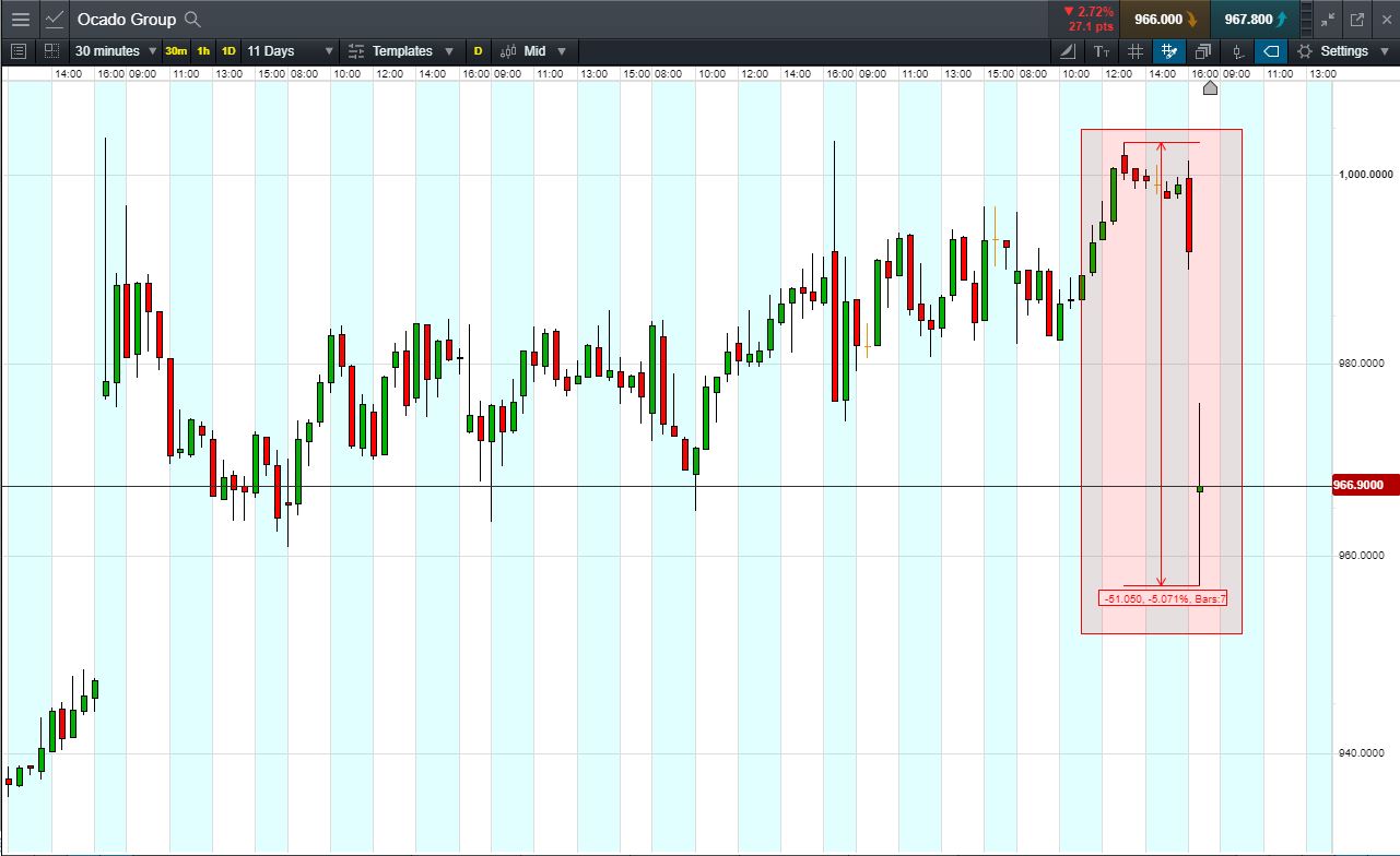 Let’s say you feel that the stock is a bargain and you think could bounce back towards recent high of 1006p. You decide to buy exposure to £10,000 worth of Ocado using a CFD, at the current price of 966.9p. To do this, you need £2,000.