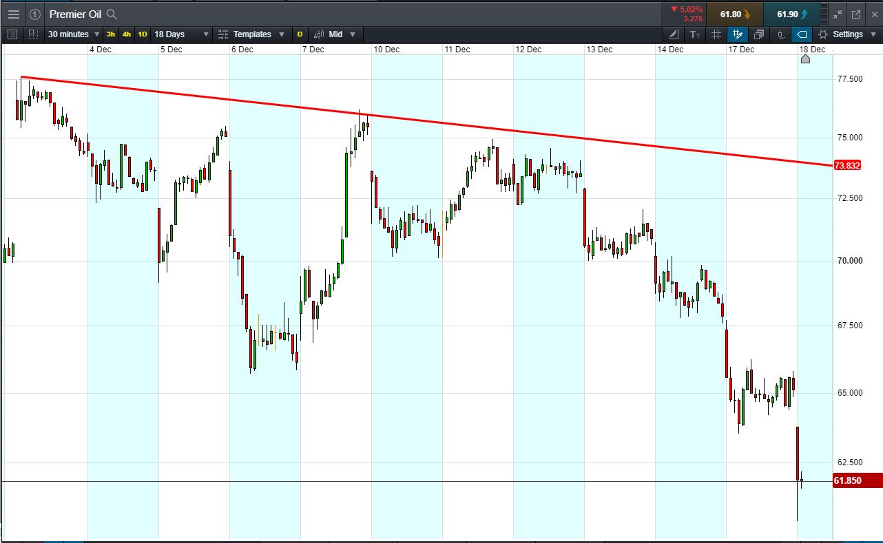 - Premier Oil shares have fallen close to 23% from recent highs (7 Dec). Down as much as -7% today.