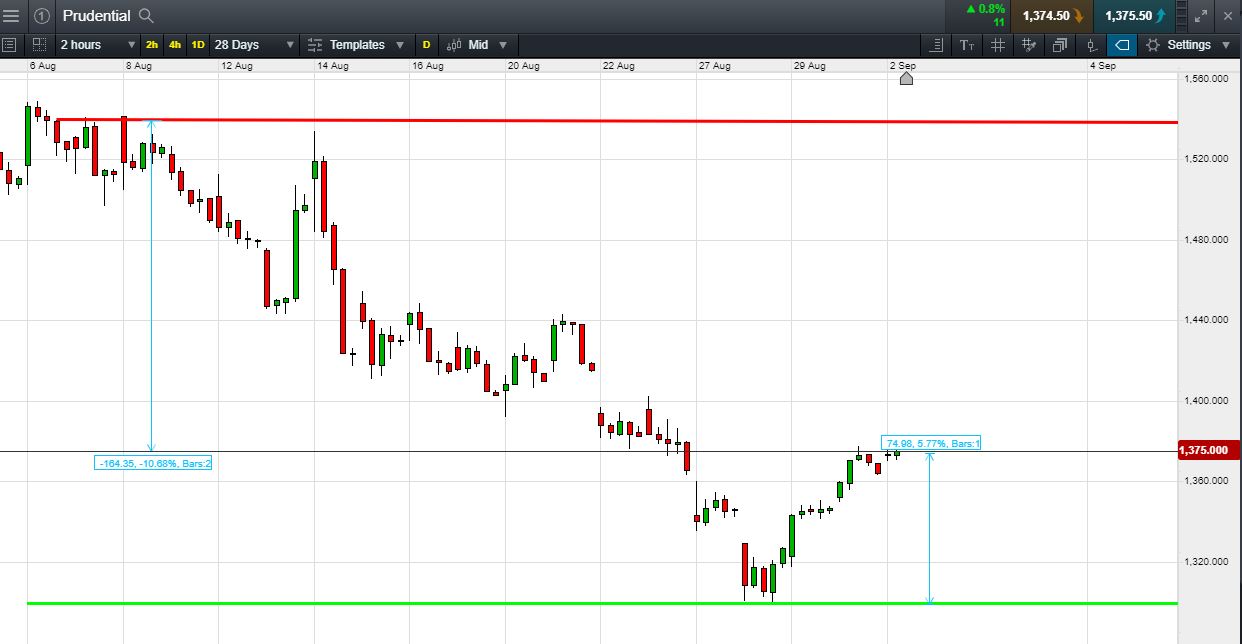 - Prudential shares have fallen over 10% in the last 3 weeks to trade 1375p (at time of writing).