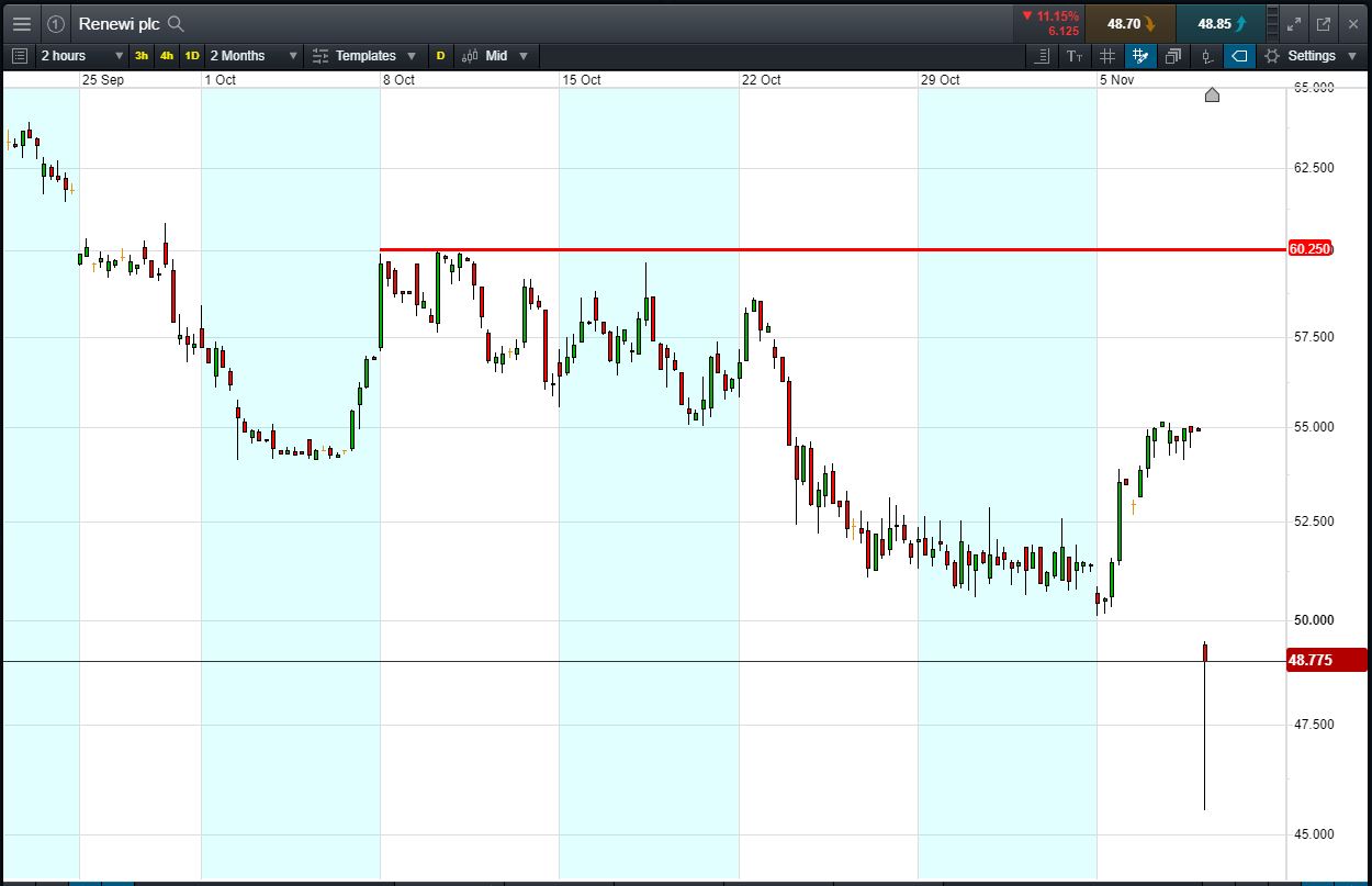 Let’s say you feel that the stock is a bargain and you think it could bounce back to recent highs of 60.25p. You decide to buy exposure to £10,000 worth of Renewi using a CFD, at the current price of 48.77p. To do this, you need £2,000.