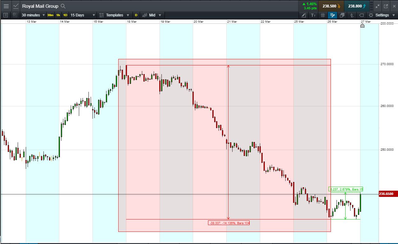 Let’s say you feel that the stock is a bargain and you think could bounce back towards 271p . You decide to buy exposure to £10,000 worth of Royal Mail using a CFD, at the current price of 238p. To do this, you need £2,000.