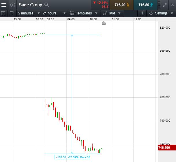 - Sage Group shares have fallen 12.6% this morning to trade 716p (at time of writing)