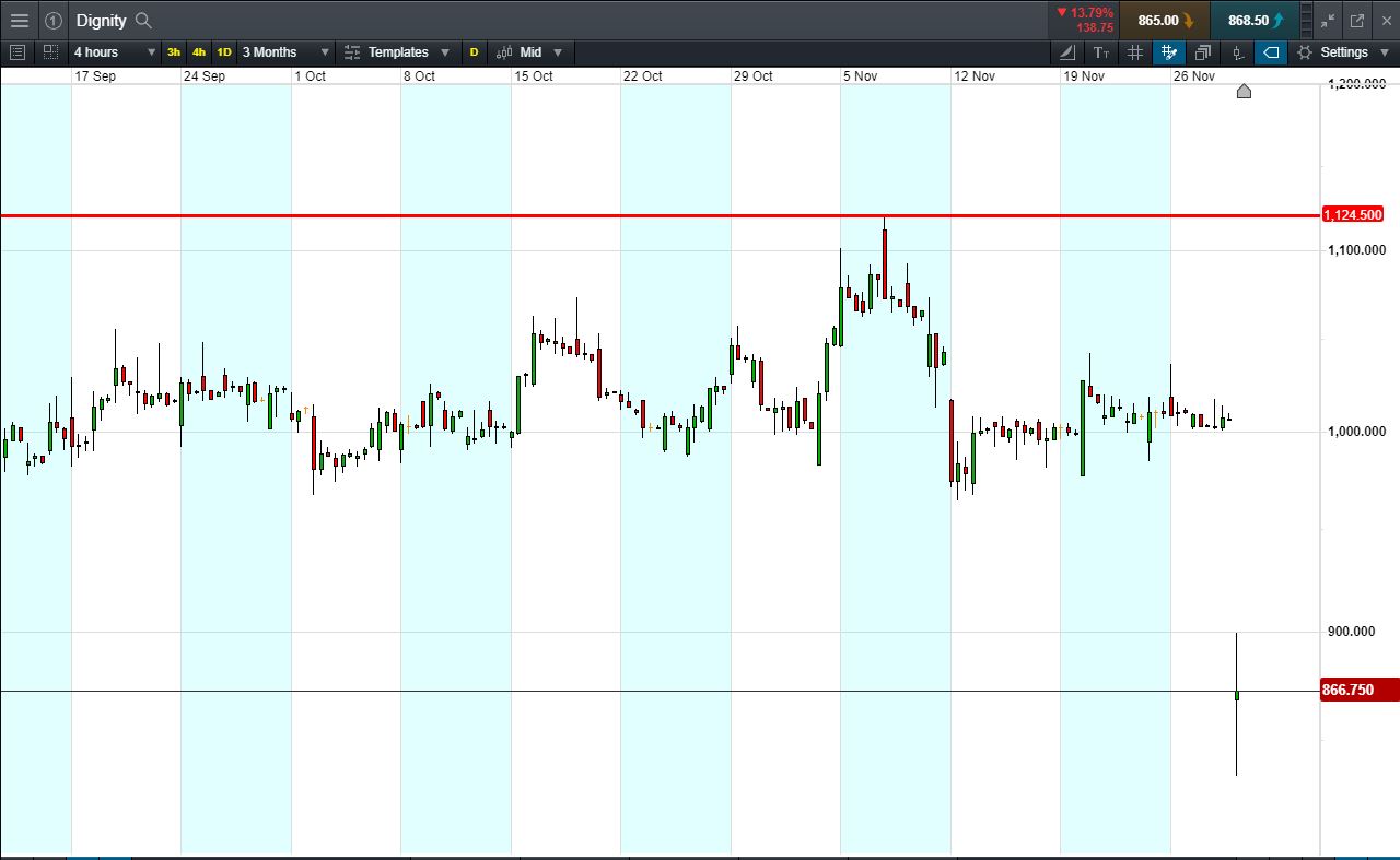 Will Dignity continue falling, or will it rise again back to 1124p November highs?