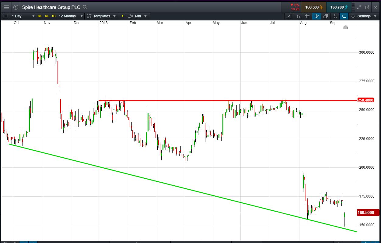- Spire Healthcare shares are trading close to falling lows support line around 144p.