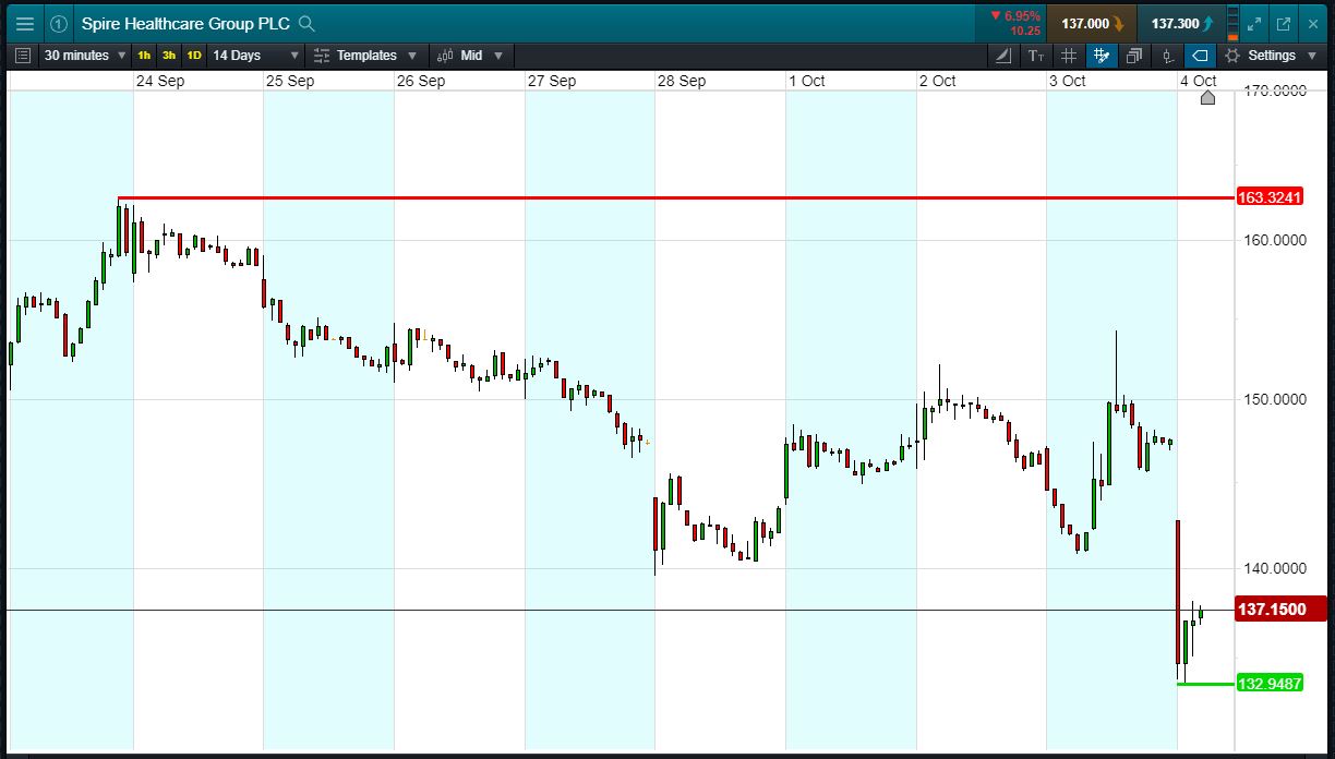 Let’s say you feel that the stock is a bargain and you think it could bounce back to recent highs of 163p. You decide to buy exposure to £10,000 worth of Spire using a CFD, at the current price of 137p. To do this, you need £2,000.