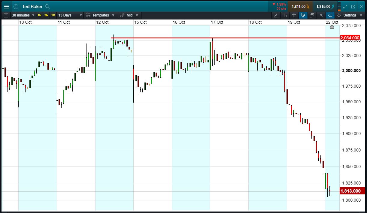 - Ted Baker shares have fallen over 11% in the last week to trade 1813p (at time of writing).