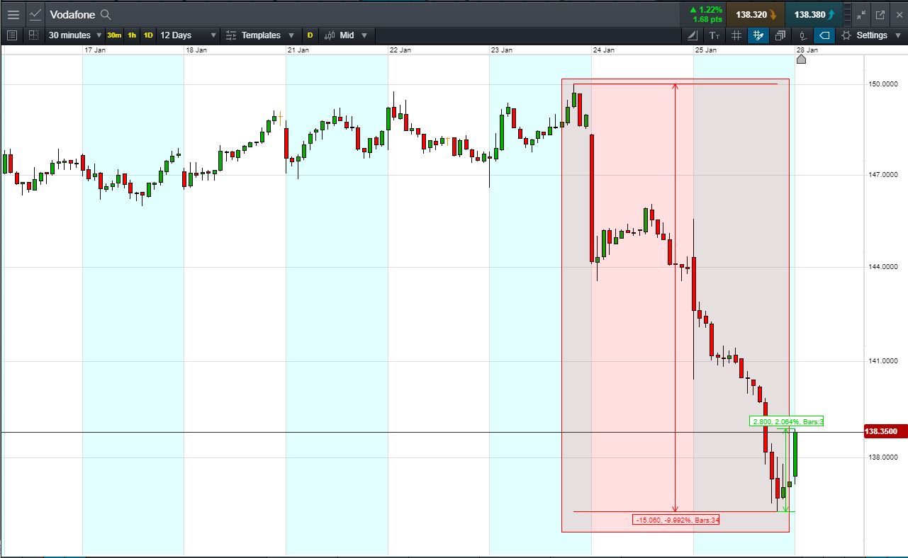 Let’s say you feel that the stock is a bargain and you think could bounce back towards recent high of 150.7p. You decide to buy exposure to £10,000 worth of Vodafone using a CFD, at the current price of 138p. To do this, you need £2,000.