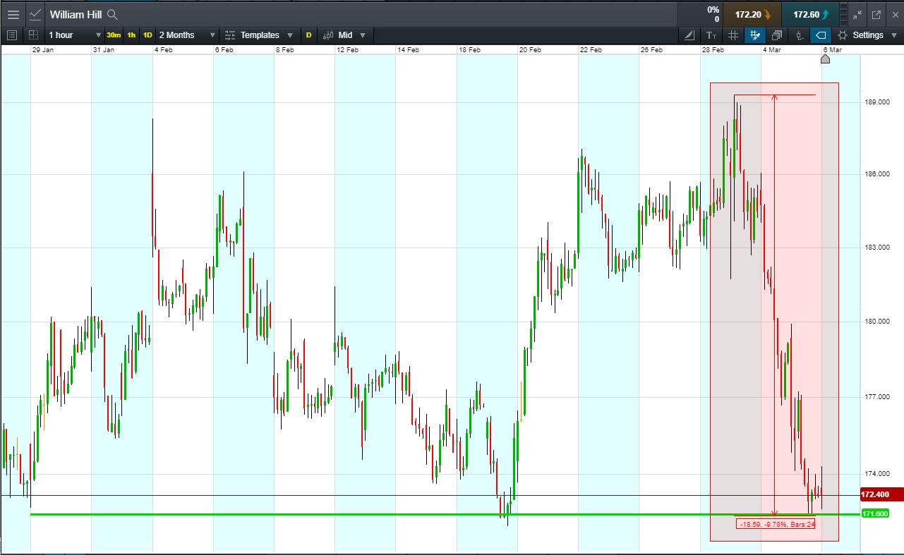 - William Hill shares -9%; bounced +0.4% up from 171p support