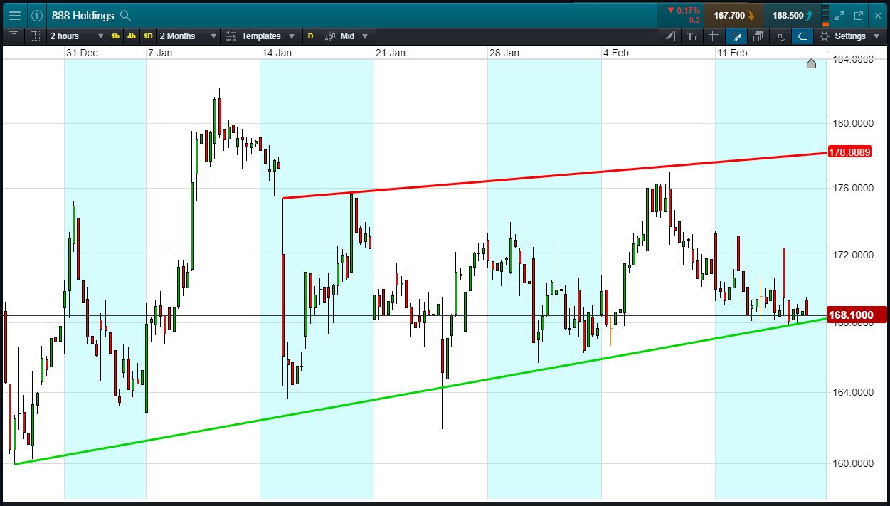Let’s say you like the 888 chart and you think the price is heading back towards 178p again. You decide to buy exposure to £10,000 worth of 888 using a CFD, at the current price of 168p. To do this, you need £2,000.