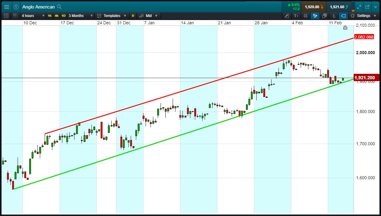 Let’s say you like the Anglo American chart and you think the price is heading back towards 2100p again. You decide to buy exposure to £10,000 worth of Anglo American using a CFD, at the current price of 1921p. To do this, you need £2,000.